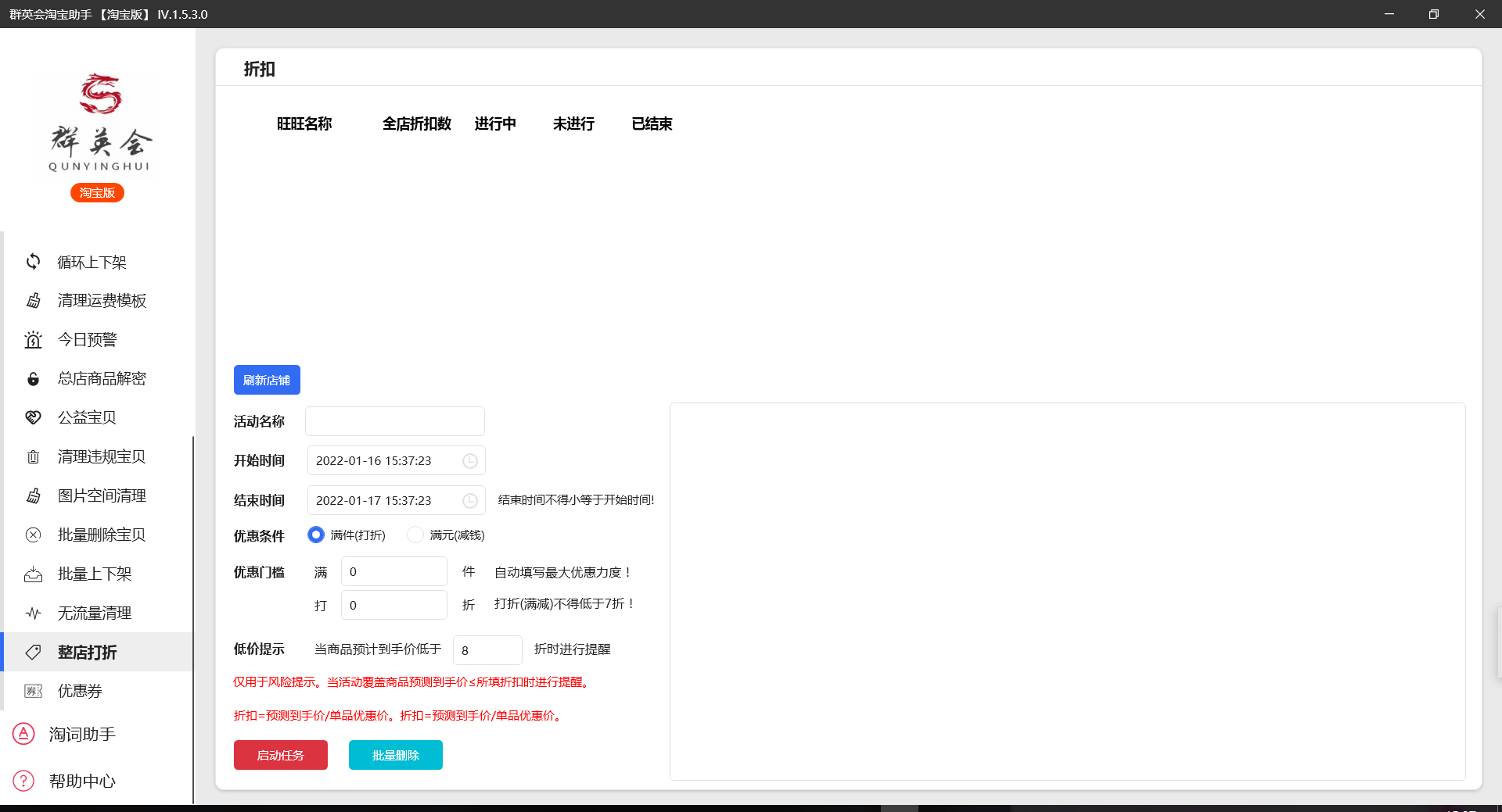 更有淘词,清理无流量,分割详情,体检中心云违规处理,批量上下架,批量删除宝贝,循环上下架,同步宝贝,公益宝贝,清理运费模板,免费整店打折!!